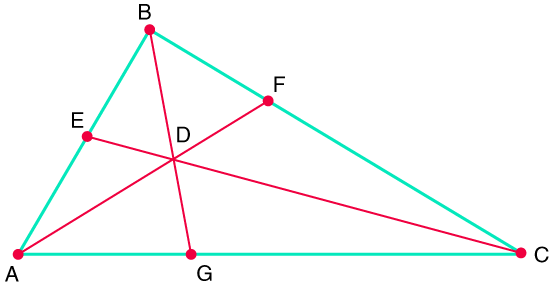 The Ceva Theorem states that in a given triangle ABC, in which CE, BG and AF be a cevians that forms a concurrent point i.e. D.